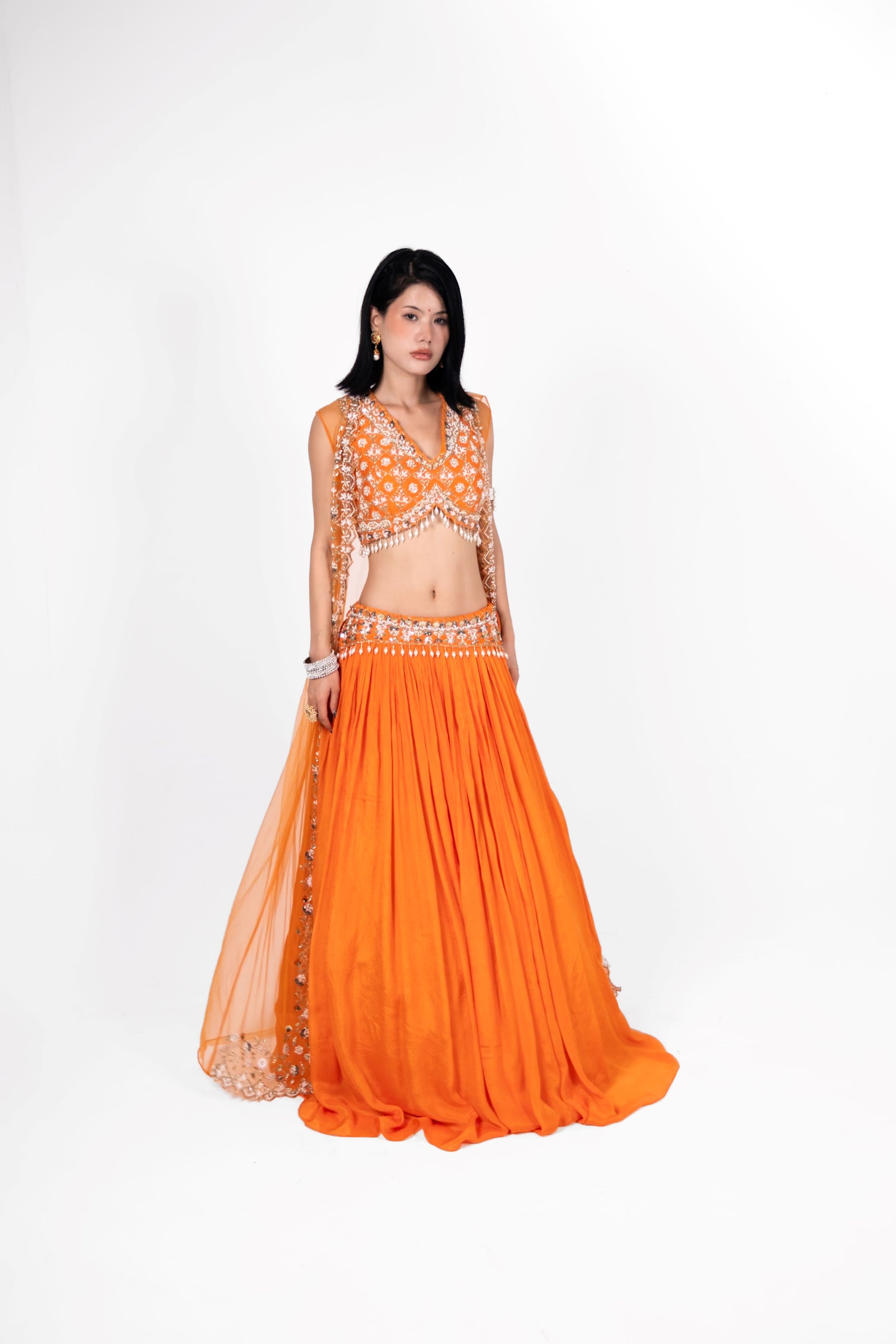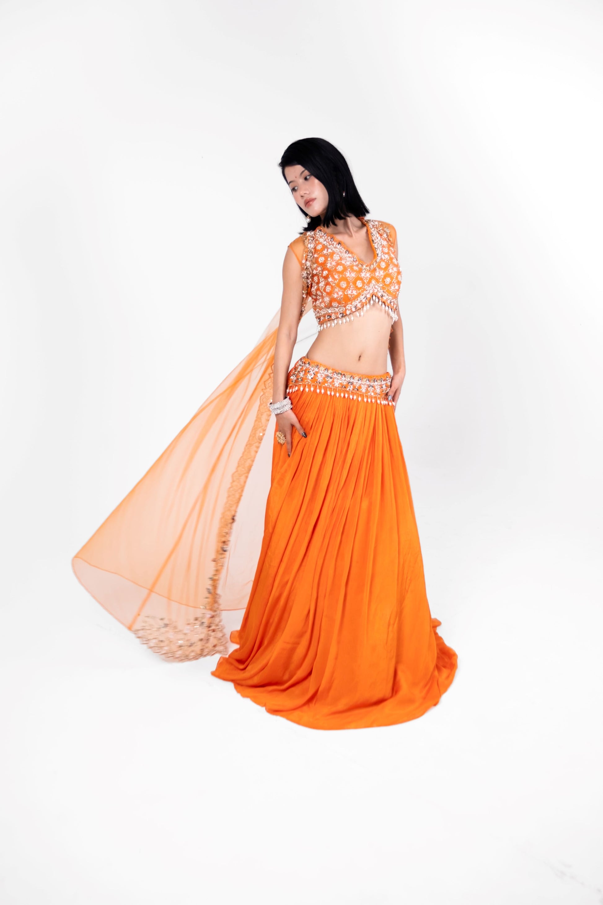 A vibrant orange lehenga in silk-blend fabric, paired with a sleeveless blouse richly embroidered with mirror work, sequins, pearls, and glass beads. The hemline and waistline are finished with intricate handwork, while the sheer dupatta is edged with floral bead embroidery. The blouse embroidery alone takes 120–140 hours, lehenga finishing around 50–60 hours, and dupatta detailing another 40 hours.
