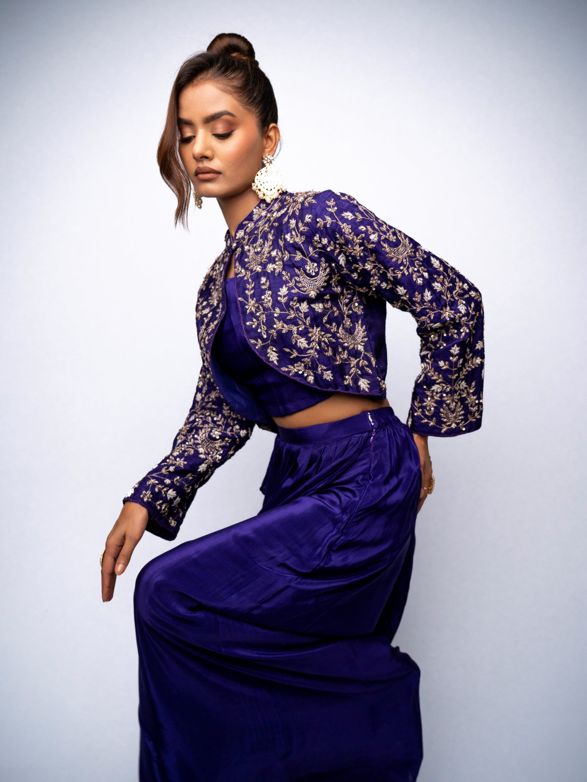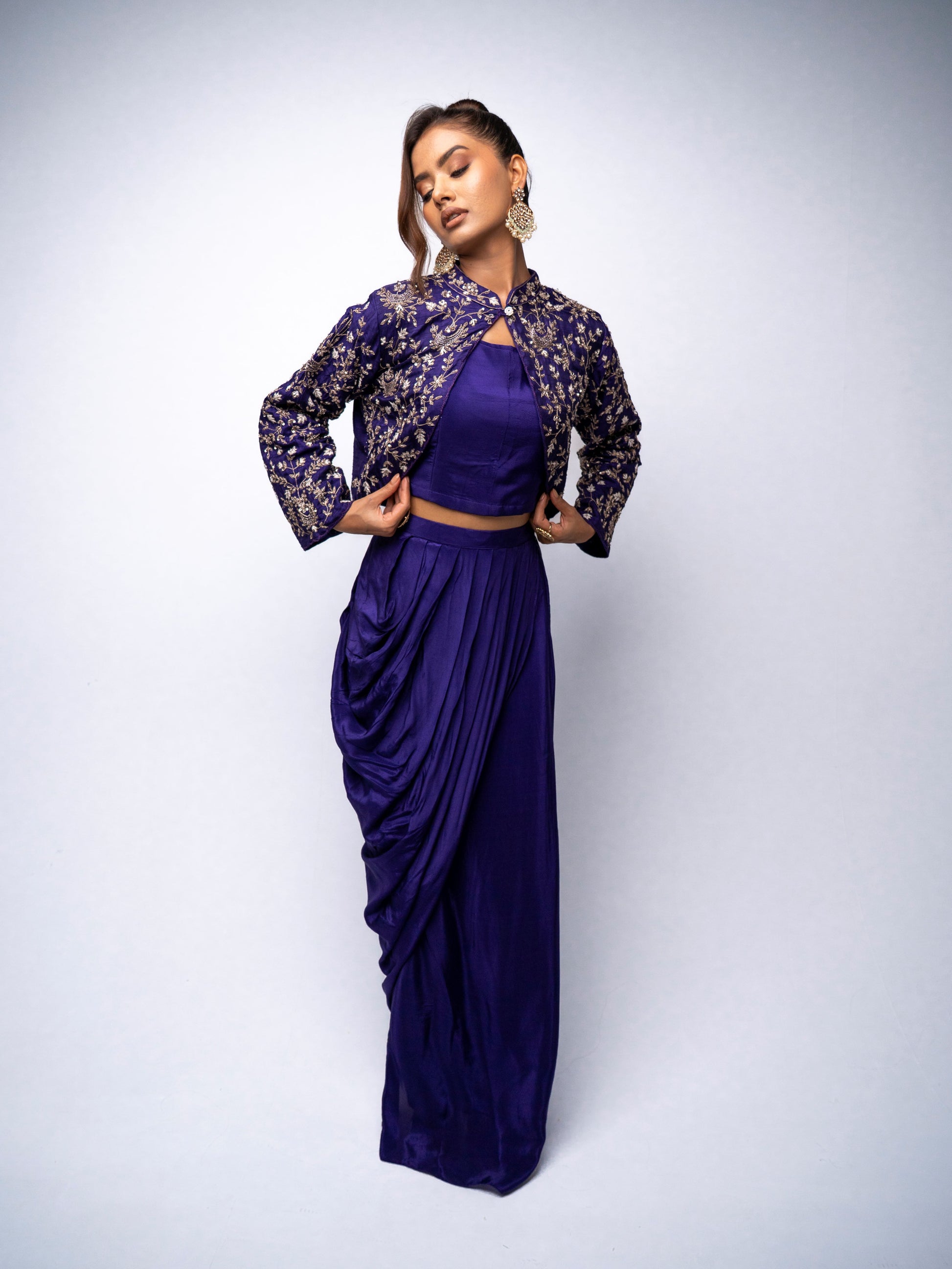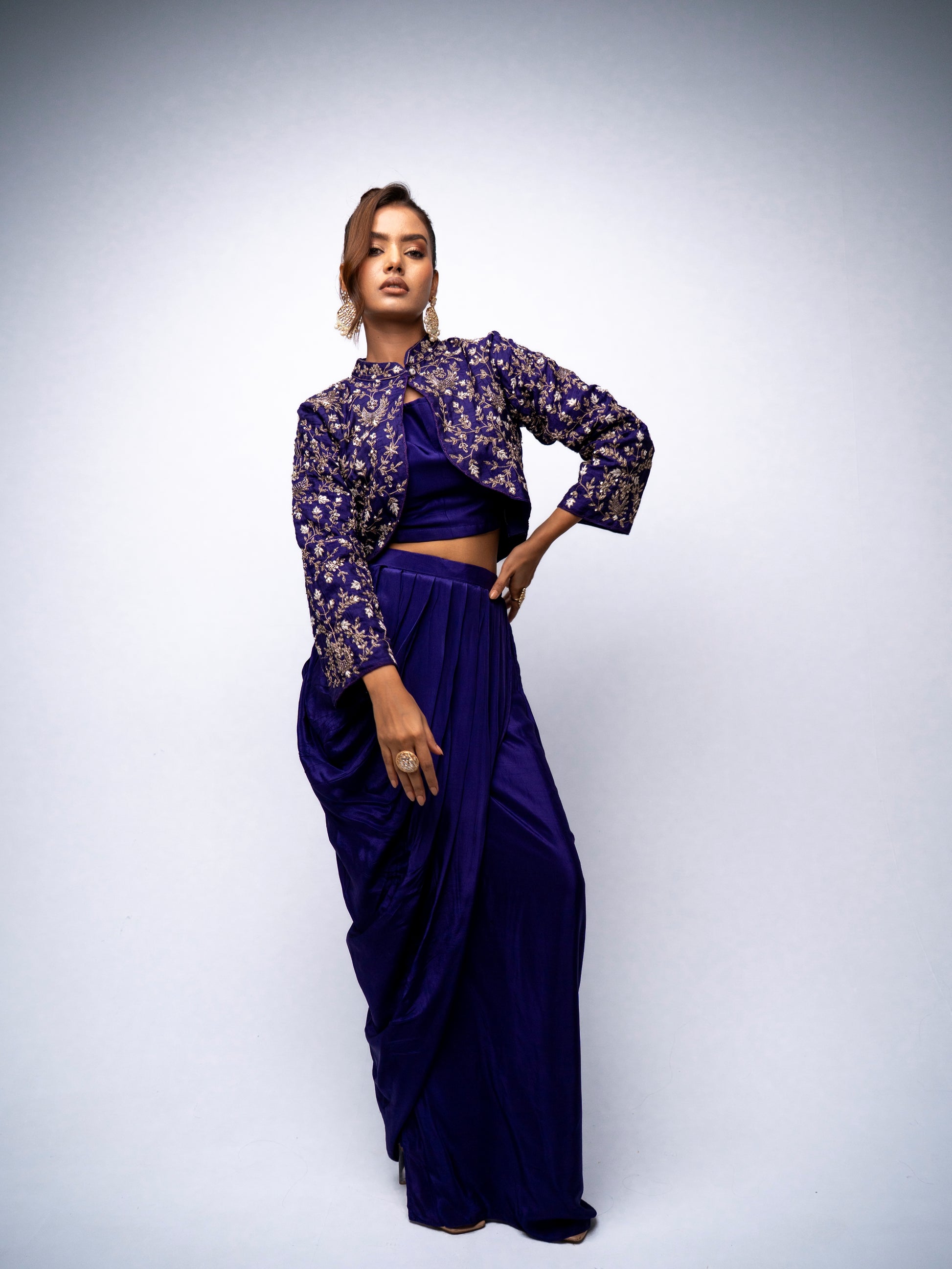A midnight blue satin-georgette pre-stitched saree paired with a raw silk bolero jacket, hand-embroidered using zardozi metallic threads, sequins, and beads. The embroidery alone takes 180 to 200 hours, with saree finishing adding another 25 hours. Rich jewel tones with glimmering gold detailing make this a perfect choice for evening soirées ; a piece that embodies opulence and timeless allure.